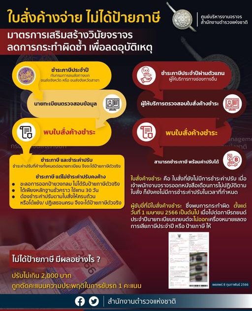 ผู้ขับขี่ที่มีใบสั่งค้างชำระ ซึ่งพบการกระทำผิด ตั้งแต่วันที่ 1 เมษายน 2566 เป็นต้นไป( ไม่มีผลย้อนหลัง ) เมื่อไปต่อภาษีรถยนต์ประจำปี นายทะเบียนรถยนต์จะไม่ออกเครื่องหมายแสดงการเสียภาษีประจำปี หรือ ป้ายภาษี