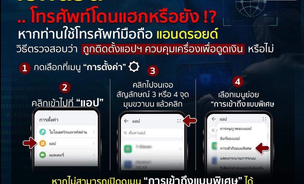 ทั้งนี้หากไม่สามารถเปิดดูเมนู “การเข้าถึงแบบพิเศษ” ได้ และหน้าจอเด้งกลับไปที่หน้าจอหลักทันที แสดงว่ามือถือเครื่องนั้นถูกฝังแอปฯ ควบคุมเพื่อดูดเงินเรียบร้อยแล้ว